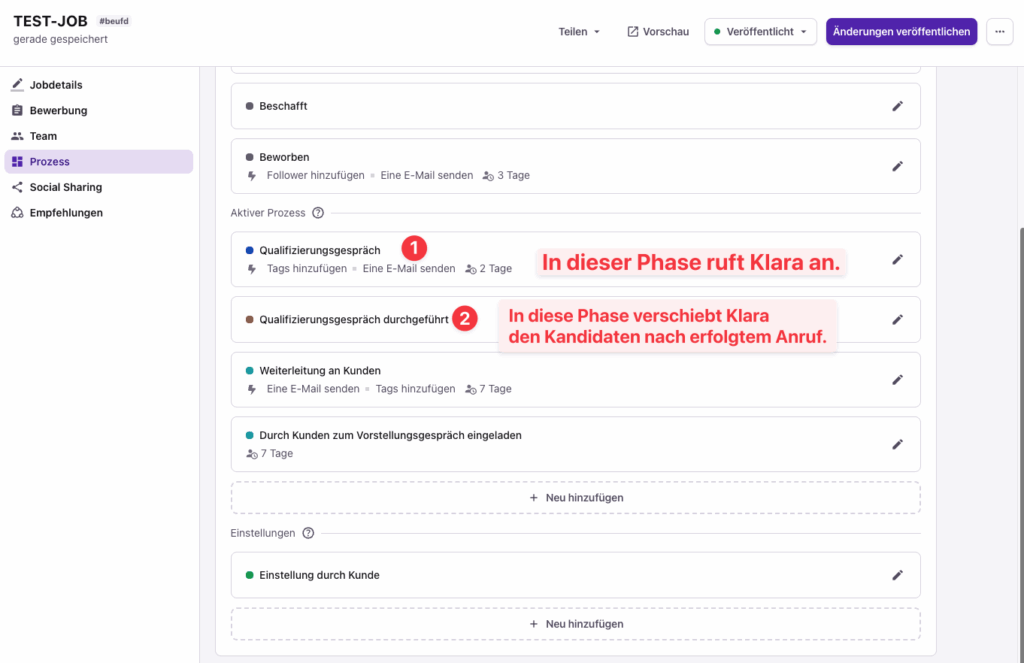 Nun bearbeiten Sie zunächst einen beliebigen Jobslot in Recruitee, indem Sie die Pipeline-Phase (hier z. B. „Qualifizierungsgespräch“) definieren (Bild unten, Nr. 1), bei der Klara die Bewerber telefonisch kontaktieren soll.