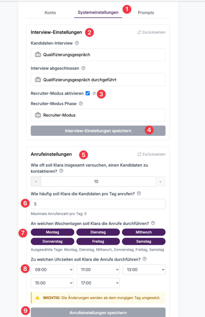 - Wie häufig soll Klara Kandidaten pro Tag anrufen: Geben Sie an, wie häufig an einem einzelnen Tag ein Anrufversuch gestartet werden soll.